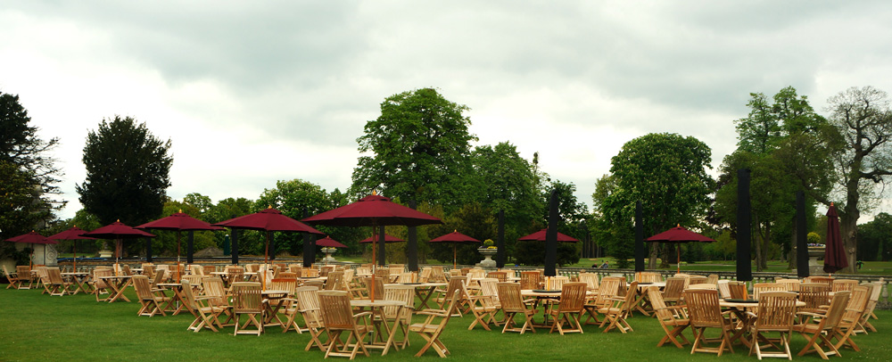 Sturdy and comfortable folding chairs with arms, alongside eight- and four-seat folding tables were specified – so that they could be easily stacked away for the winter. Burgundy parasols were included to complement Stoke Park’s corporate colours, and lazy susans were integrated into the intricately-carved ringed design of the tables.