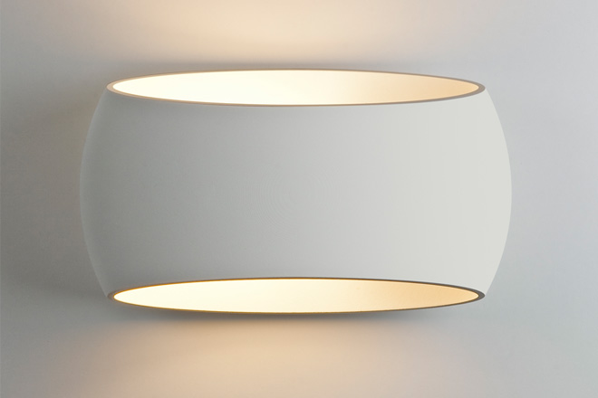 Among the eye-catching designs on display was the Aria wall light. Aria is a crisp white plaster wall light with specially-designed converging ellipses, which provide both bright, reflected light and a soft wash of illumination, creating a striking pattern and a soft glow.