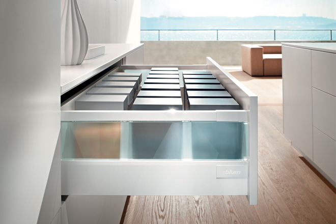 Blum’s Movento runner system for wooden furniture is available in a wide product range and has a high level of running characteristics. The concealed solution is designed for dynamic loads of 40 and 60kg, with high stability and low sag values. Movento was shown as an ideal basis for thick pull-out shelves for objects such as hi-fi systems.