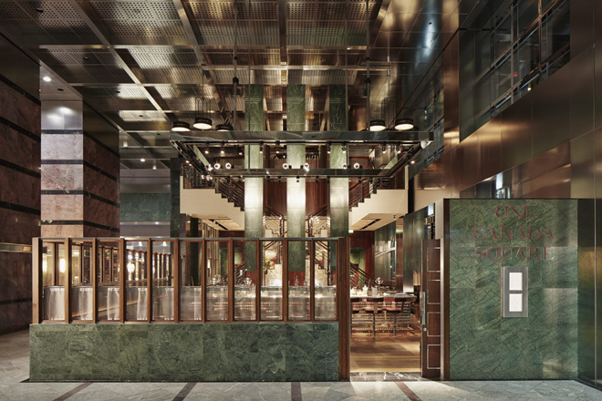 Located in the iconic 50-storey One Canada Square building in the heart of Canary Wharf, the new One Canada Square restaurant offers a luxurious and modern dining experience. Operated by ETM Group, the restaurant and cocktail bar features interiors designed by David Collins Studio and lighting by Dernier & Hamlyn.