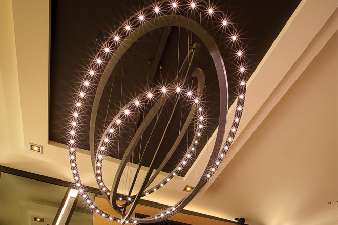 Suspended by fine wires from the ceiling, the chandelier comprises five elliptical rings that are positioned at varying angles. The ellipse rings are illuminated by mini LED lights with the drivers cleverly concealed in the ceiling plate.