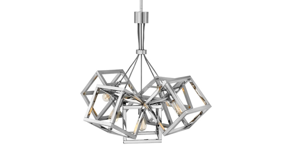 The Ensemble chandelier pictured is designed by Fredrick Ramond for Hinkley Lighting. Its daring silhouette combines layers of sleek edges with a bright, gleaming Polished Nickel finish to create a captivating form from any angle.