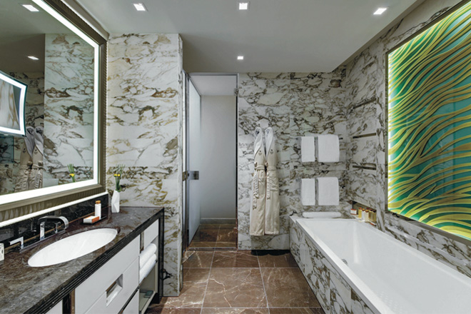 The Kaldewei baths in the Waldorf Astoria Berlin have another special feature in the form of anti-slip enamelling. This structured surface is made from a combination of quartz and sand, which is burnt firmly into the steel – meaning that the discreet anti-slip enamelling offers maximum safety underfoot, no matter how much the bath is used.