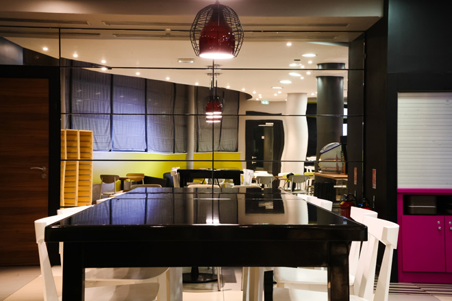 To continue the modern theme and give a feeling of open space, ColorCore surface in black gloss was used for the top guest tables. The hardwearing characteristics of ColorCore make it suitable for high-traffic environments where there is a risk of scratching and impact damage.