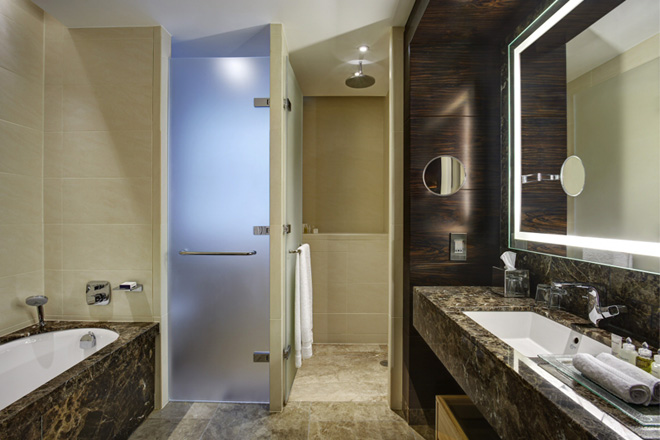 256 guest rooms are spread across six floors, and include 45 individually-decorated suites with a separate lounge and bedroom. All bathrooms are finished to a high specification, and feature luxury products from international bathroom specialist, Hansgrohe, and its designer brand, Axor.