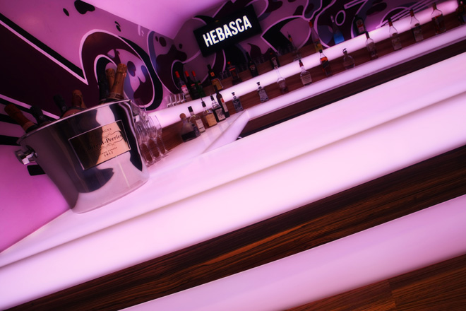 Owners of the Hebasca Group say that the bar design delivers a “no-nonsense, design-conscious delight” where VIPs and locals can kick back with a cocktail, a caffeine shot or a bottled beer. Lighting in the form of an LED colour-changing strip was used to backlight the Hi-Macs Opal on the bar front, which has been designed in horizontal panels interspersed with zebrano wood strip veneer. The material offsets the rest of the bar, contrasting the ultra-modern with age-old, natural, exotic aesthetics.