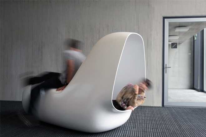 SleepBox is a contemporary, organic piece of furniture, designed with the demands of an increasingly urbanised environment in mind. A sinuous object which creates a place of comfort and relaxation within airports, offices or other semi-public spaces, the smooth, uniform shell of SleepBox is made of Hi-Macs, and contains a leather-covered mattress.