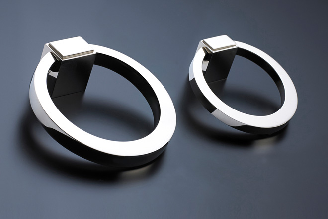 Made from solid machined brass and finished in polished nickel plate, the handles are available in 50 and 64mm diameter sizes, and feature a subtle pip on the rear in order to prevent marking of furniture.