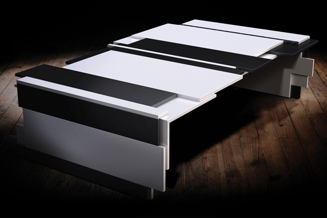 The three themes for the Puzzle tables are: the Pablo colour model in an explosion of bright colours; Andree in black and white, which remains a great interior decor classic; and Auguste, a monolith clad in white, which evokes the feeling that it has been hewn from a block of stone.