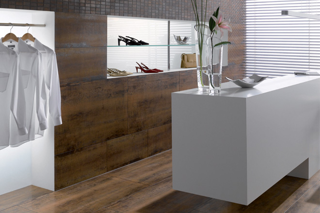 RAK’s Paradox range also offers metallic options, such as a collection of semi-polished grey- and orange-toned porcelain tiles, available in both flush rectangular and square mosaic formats.