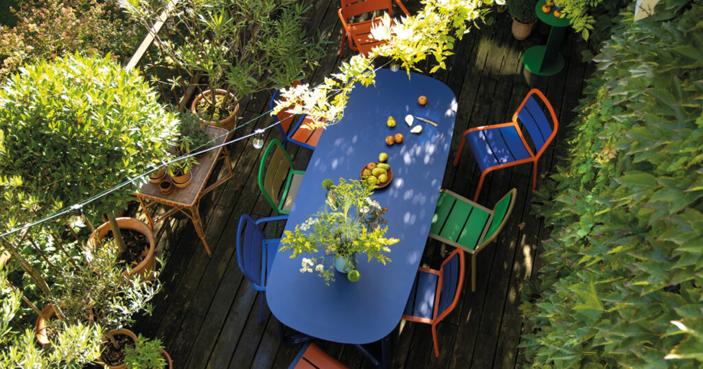 Combining bold colours with elegant flowing curves will add impact and personality to any outdoor space as shown here with Marumi – a striking dining set designed by Thomas Sauvage for Ego Paris.