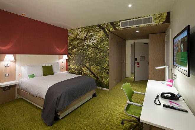 Earthy, organic tones of green displaying a contemporary leaf motif runs throughout the public areas, while the corridors and guest room carpets are reminiscent of foliage underfoot, akin to that of the surrounding woodland.