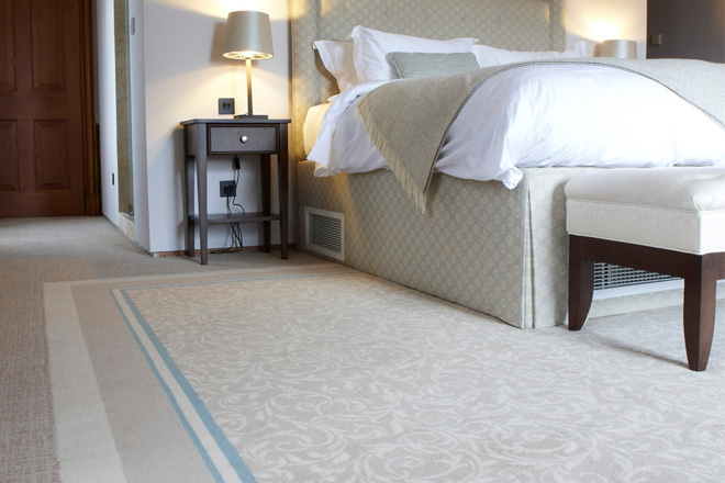 Within the principal bedrooms of the hotel, a bespoke carpet featuring delicate inlaid scroll designs and elegant stripe borders gives the bedrooms a contemporary feel. A bespoke turquoise colour was added to the soft, neutral shades taken from the Optimum colour palette to co-ordinate with the elegant fabrics, creating a contemporary harmony with the traditional panelled walls and ceilings. The carpets are woven in seven-row axminster with an 80/20 construction.