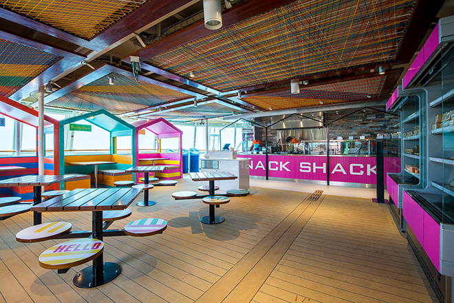 Bursting with colour and personality, Snack Shack is a casual dining option located on the pool deck. An iconic British flavour presides here, with brightly painted beach huts doubling up as dining booths.