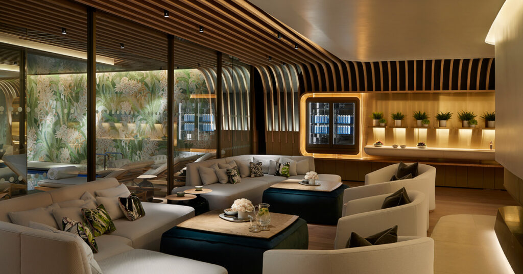 The wellness space has been specifically created to bring a sense of the outside in, referencing artistic flora using traditional Roman-style mosaics from Venetian artisans. Natural timbers and light-coloured stone bring a sense of calm and tranquility, while timber-slatted ceilings have been integrated to create better acoustics within the pool, gym and relaxation lounge. The entire space has been generously arranged to maximise the sense of spaciousness.