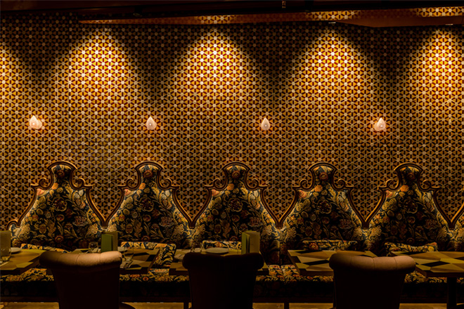 “The design of the venue combines Mauresque traditional architecture and vintage Moroccan furniture with somewhat of a flair inspired by Sowwah Square,” Annabel says. “The false ceiling, as in the traditional Moroccan markets, is formed of wooden blades. Painted in a range of brown hues, oranges and soft pinks, the ceiling blades span the restaurant all the way to the covered terraces, creating a strong visual perspective.”