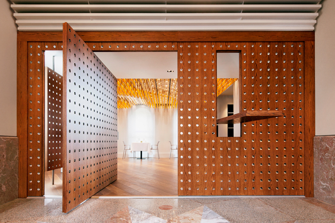 Large, perforated doors partially screen the restaurant from the entrance lobby, the perforations pick up the grid of the ceiling, while an oak floor laid at a 30° angle invites diners into the space and lacquered walls create a calm interior where the food will always be the star.