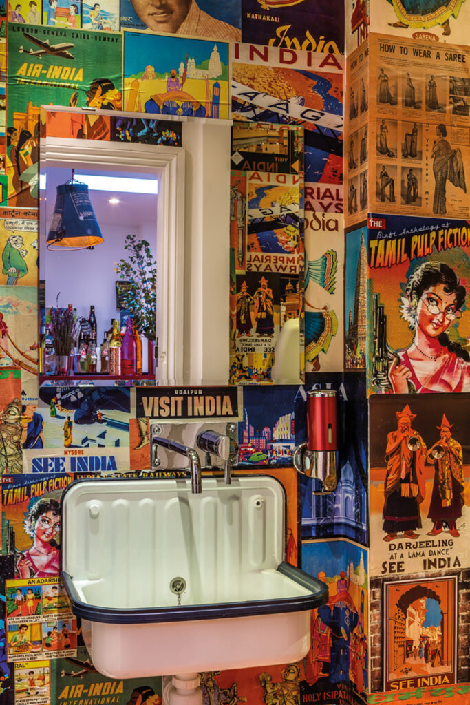 Up-cycled vintage Indian bucket lamp-shades maintain the street scene vibe, while vintage tin tile wallpaper adds a sense of depth and texture to the space. Even the toilets feature colourful bespoke Indian magazine articles across their walls.