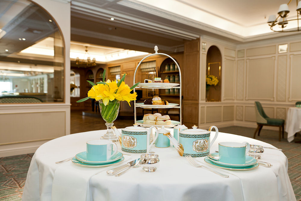 The refined, Georgian-style interior was completed by David Collins Studio. Featuring garden-inspired fabrics and porcelain set in a wash of white, gold and eau-de-Nil hues, the design is an ideal reflection of the Fortnum & Mason brand.