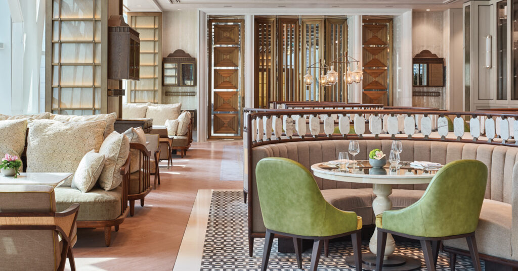 A balance of Eastern culture and Western colonial influence is felt throughout the hotel’s F&B spaces, and displays itself here through the incorporation of materials traditionally used in Malaysian crafts – such as leather, glass and bronze – as well as the use of Western-style shutters on surrounding columns.