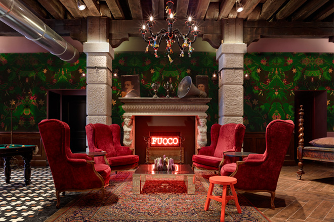 Further pieces have been sourced by Anwar Mekhayech, who drove around Italy in a Fiat van in the run-up to the hostel’s launch, visiting antique markets such as the famous Fiera di Parma, and the monthly outdoor market, Piazzola sul Brenta. At these events, Anwar purchased mis-matched furniture such as an old apothecary cabinet – which becomes the backdrop to the DJ booth – a four-poster bed, carpets, art, mirrors, and amusing and memorable curiosities, such as a neon sign situated in the fireplace that reads fuoco – the Italian for fire.