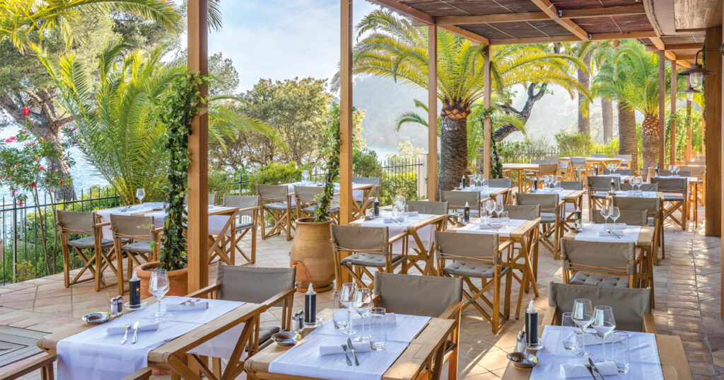 The Loup de Mer is the hotel’s chic, yet down-to-earth bistro, profiting from an enivable terrace that faces the Golden Islands. For the restaurant’s interior, François opted for planks of redwood and pine, painted in white, folding tables, wooden chairs with linen seat upholstery and colourful cotton cushions covering the banquettes.