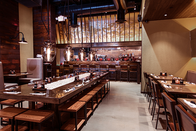 In lieu of the bland choice of drywall, traditional Japanese stucco walls and rustic wood finishes were selected to create a more authentic dining experience.