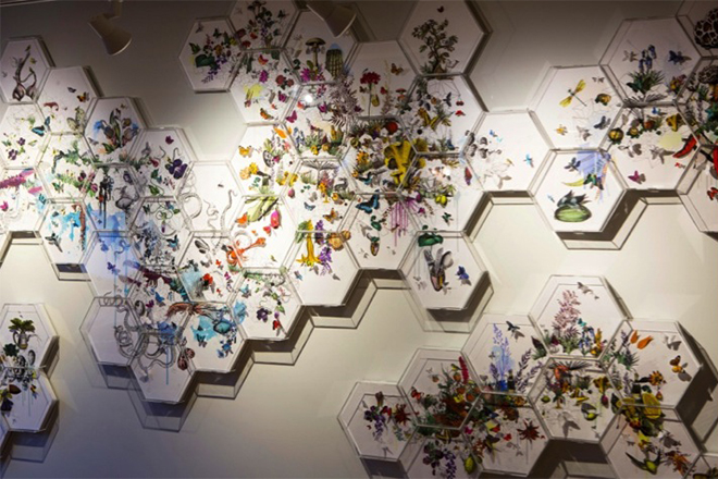Williams’ universe of colourful flora and fauna look out through hexagonal glass windows, tessellating to form three distinct islands across the wall.