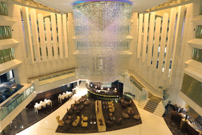 The lobby opens into an impressive five storeys in height, with dramatic vertical features that compel visitors to lift their gaze upwards. A spectacular light sculpture of delicate golden leaves cascades 20m down into the centre of the space, while striking vertical columns encased in creamy marble are bathed in filtered sunlight from above. Horizontal rows of balconies, also marble-clad, are accentuated and reflected in the mirrored ceiling.
