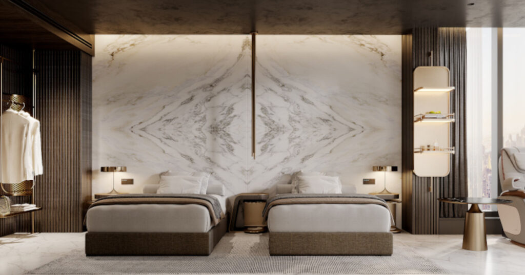 Defined by its striking exterior, The Xadia Hotel is easily identifiable by an illuminated crown structure sitting atop the tower, brightening the horizon. The crown personifies modest refinement through architecture, a testament to the beauty found in clean lines and uncluttered form, while representing a departure from excessive ornamentation, focusing instead on the power of understatement. Conceived as a symbol of New York’s enduring spirit, the design reflects the city’s resilience, determination, and unwavering commitment to progress, embracing diversity through universal appeal and establishing the building as an embodiment of the city’s character and aspirations.
