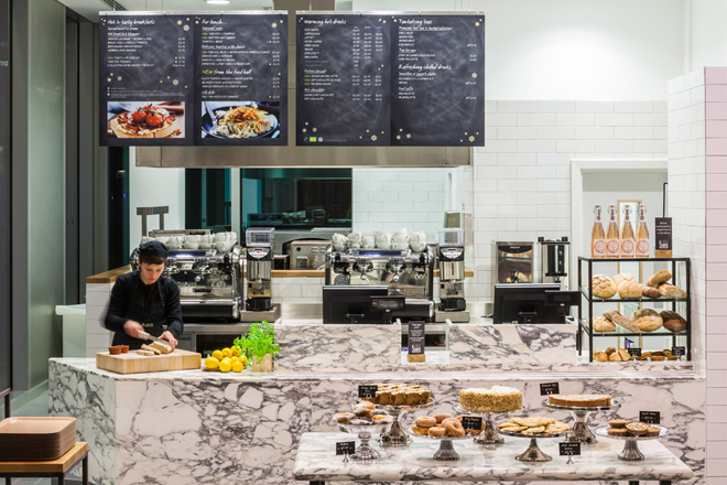 Located alongside the foyer of the company’s headquarters in Paddington, the canal-side eatery is the latest cafe Kiwi & Pom has designed for Marks and Spencer.