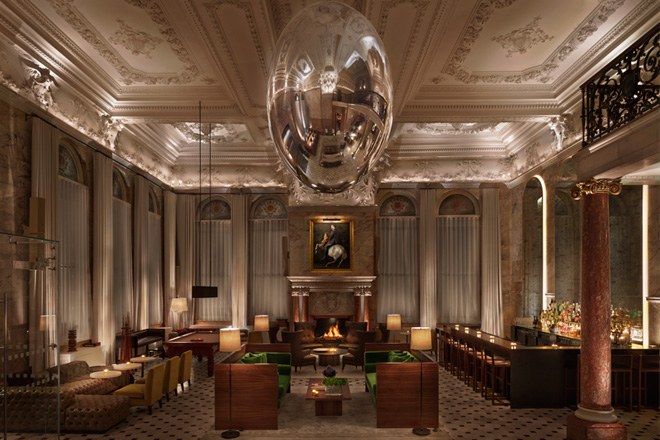 The lobby acts as a juxtaposition between the existing restored traditional spaces and modern insertions. Inspired by American minimal artist, Donald Judd, the space features green velvet sofas, tufted khaki leather sofas and modern wingback chairs. The mirrored egg installation was created by lighting artist, Ingo Maurer.