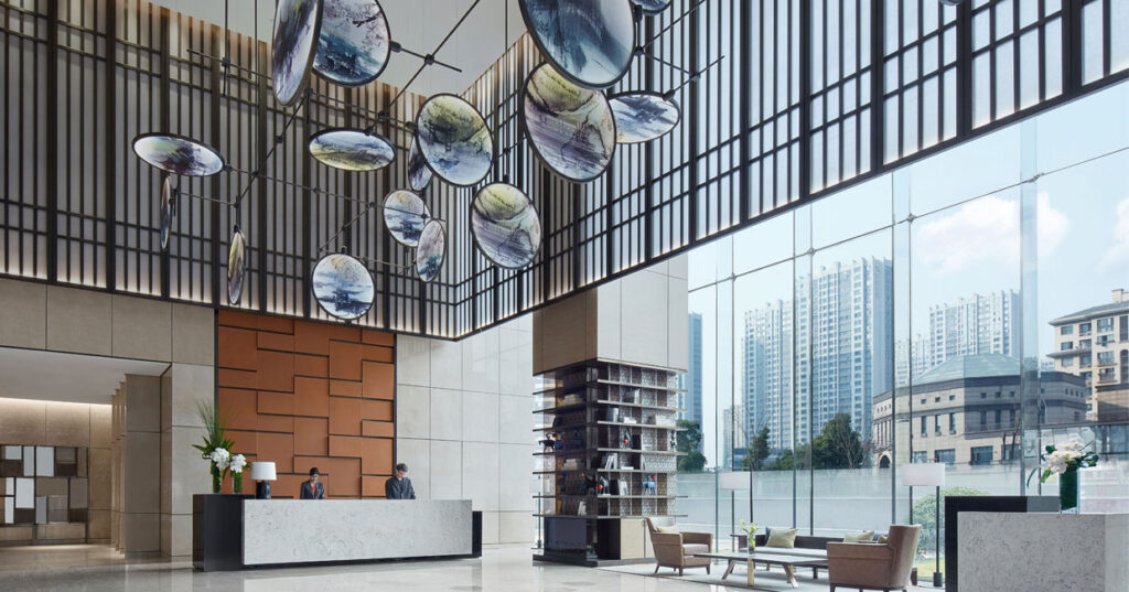 Artworks are also prominently showcased at the hotel. Guests will be welcomed by the artwork “Hangzhou Dream” in the lobby. Through an artistic lighting device, the artwork depicts a fan opened by a scholar who sings lyrically and recites poetry, praising the scenery of Hangzhou’s ten scenic spots. Other artworks that are featured in the hotel include Chinese ink painting, blue and white porcelain or works reflecting boating on West Lake and other elements in Hangzhou, are presented throughout the hotel.