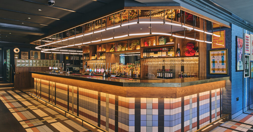 The centrepiece of the space is undoubtedly the distinctive glowing bar, a captivating showcase of design evolution. Drawing inspiration from London’s iconic transport networks, patterns, and graphics reminiscent of tube lines and the flow of travel, a striking geometric tile wrap guides guests to this central social space that buzzes with energy.