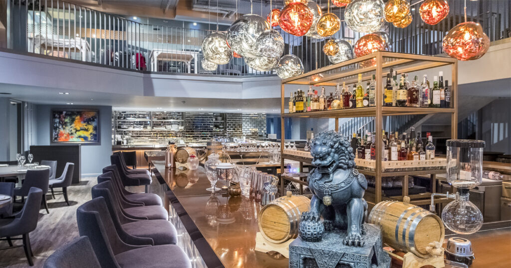 Offering diners impressive views over the Thames, the two-storey restaurant features a striking interior complete with a floral installation by celebrity florist, Larry Walshe and eye-catching light sculptures by renowned designer Tom Dixon.