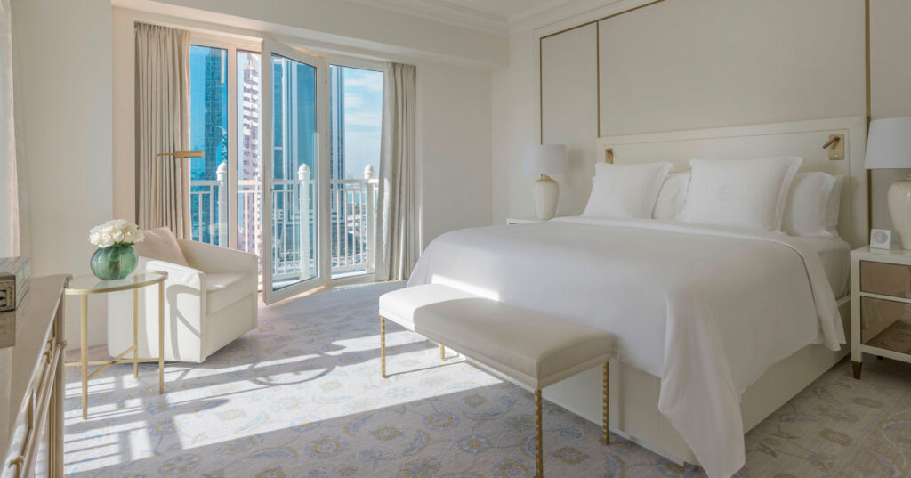 The Lobby has been enhanced with a grandiose door reminiscent of grande dame entrances, and the Lobby has been redesigned as an open-plan space, allowing light to flood through the foyer as well as boasting views of the Arabian Gulf. A hand blown glass chandelier, alongside an array of handmade and bespoke Italian furnishings, adorns the Lobby’s ceiling whilst also creating a magnificent focal point in the space.