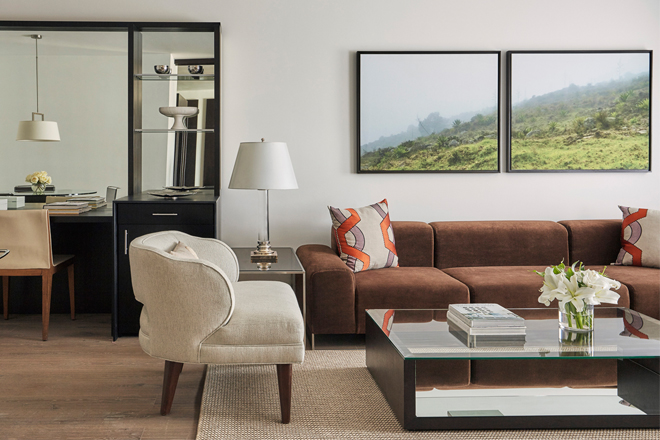 Inspired by the natural beauty of the surrounding mountains, Rottet Studio created a design aesthetic for Four Seasons Hotel Bogota combining pattern, texture, colour and craftsmanship that is epitomised in the bright new lobby. Here, wooden screens form airy ‘walls’ that climb up across the ceiling, enveloping guests in warmth accentuated with touches of rich green evoking Colombia’s famous emeralds.