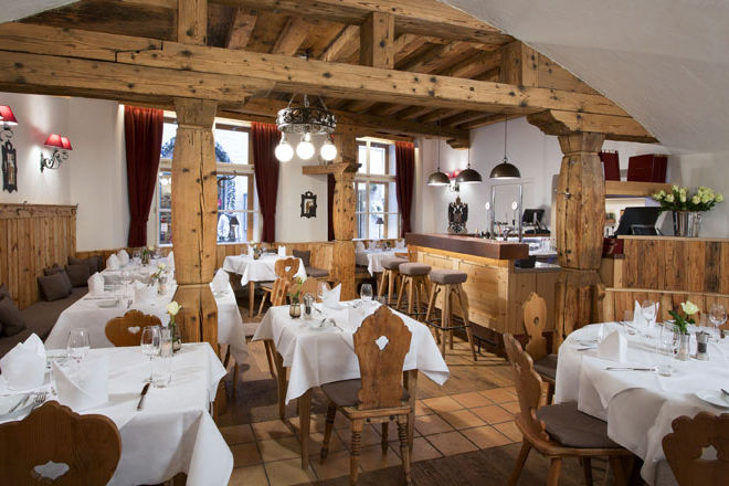 The innate rustic charm of the building and warmth of Alpine style is celebrated by the hotel’s Gasthof Goldgasse restaurant, with hefty timber beams, newly upholstered wooden furniture and copper detailing.