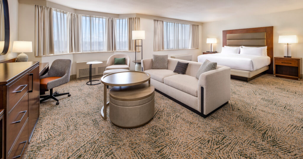 Hilton Arlington National Landing’s 393 newly refurbished guest rooms offer a relaxing respite for both business and leisure guests. The guest rooms showcase neutral tones with pops of jewel-toned coloor for a modern, refreshing atmosphere, balancing both warm and cool elements through the design. The property features an array of guestroom options including “Wellness Room by Peloton” for those looking to stay active and “Room 2 Work” designed to accommodate for traveling business guests as well as Junior Suites and spacious corner rooms.