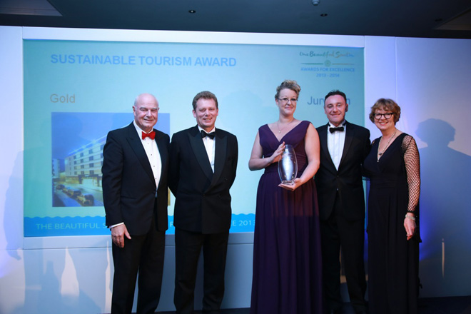 Jurys Inn Brighton has been awarded a Gold accreditation for Sustainable Business at the Beautiful South Awards for Excellence 2013. This success follows the hotel receiving the Responsible Business Award at the Sussex Business Awards 2013, where it was also highly commended for the Most Sustainable Business award. Held at the Felbridge Hotel, West Sussex, this year’s Beautiful South Awards was co-hosted by Tourism South East chairman, Ken Robinson, CBE and travel journalist and broadcaster, Alison Rice.