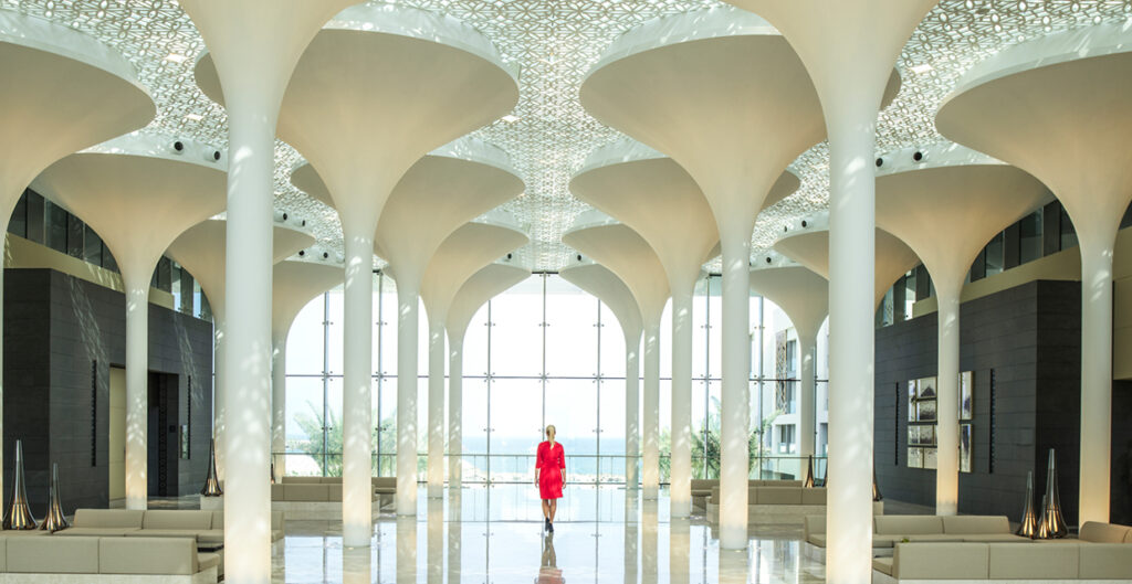 The façade of the hotel’s buildings is inspired by the landscape of Old Muscat, while the design of the lobby originates from the nature of lilies in a pond, and is inspired by the Al Alam Palace, the ceremonial palace of His Majesty Sultan Qaboos.