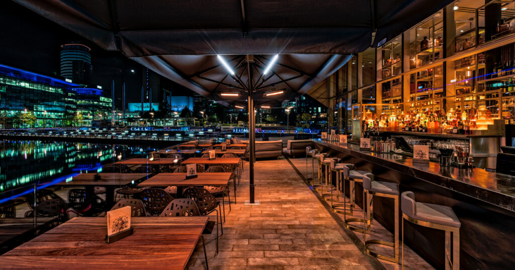 The bar wraps around from the interior to the enclosed outdoor terrace which will be ideal for al fresco drinking and dining, offering sweeping views of the water and the surrounding area which still gives a glimpse of the enduring and fascinating legacy of Salford’s industrial heritage.