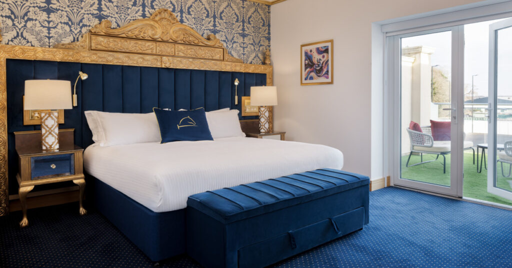 Positioned amidst hundreds of acres of picturesque countryside, the property comprises a range of accommodation options – the largest of which is the Empress Suite, where regal elegance blends with modern luxury. Inside, a palette of rich blue and gold tones creates a sophisticated ambience, complemented by polished furnishings and a striking gold headboard. The room opens out onto a balcony that wraps around the suite and offers views across the Polo Club.