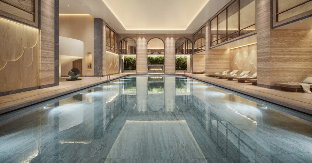 The active wellness spaces, driven by PILLAR, comprise an extensive gym and yoga studio, juice bar, striking 20m swimming pool complete with a vitality pool and steam and sauna rooms.