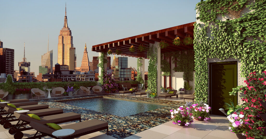 The rooftop terrace will provide a panoramic setting showcasing quintessential New York landmarks like the Empire State Building, One World Trade Center, Chrysler Building and Hudson River.