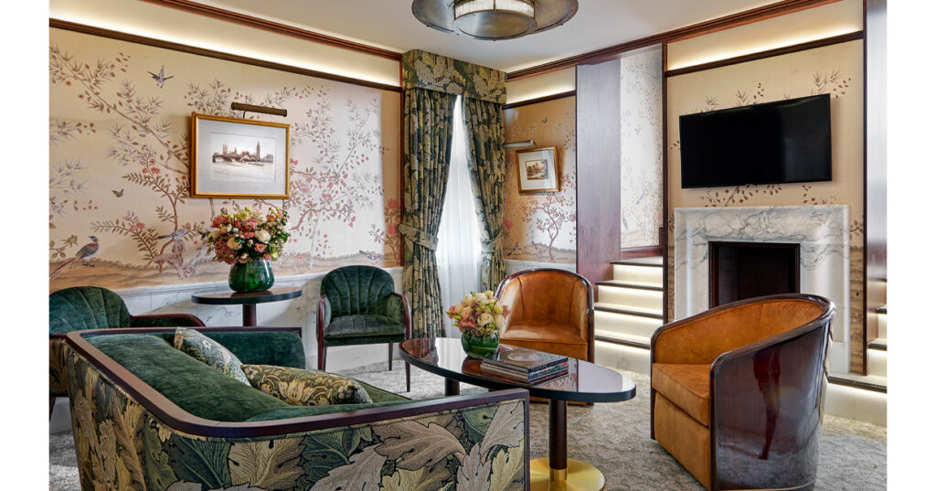 The finishes here are more luxurious with the sitting room adorned with British made wallpaper and fabrics. The custom-made wallpaper, from Fromental, again harks back to the floral undertone employed throughout the new rooms. The curtains and chair fabric, by Morris & Co fabrics, is in a green palette and imbues the space with a sense of luxury. This is further underpinned by the use of specialist British craftsmen who made much of the bespoke furniture, such as the burr walnut tabletops, giving hotel guests a typically British experience.