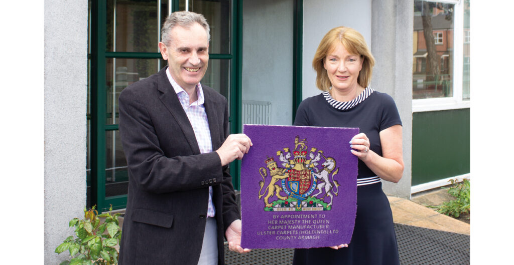 Nick Coburn CBE, Group Managing Director, and Joyce McIvor, Contract Sales Director for UK and Ireland, mark the news that Ulster Carpets have been granted a Royal Warrant by Her Majesty The Queen