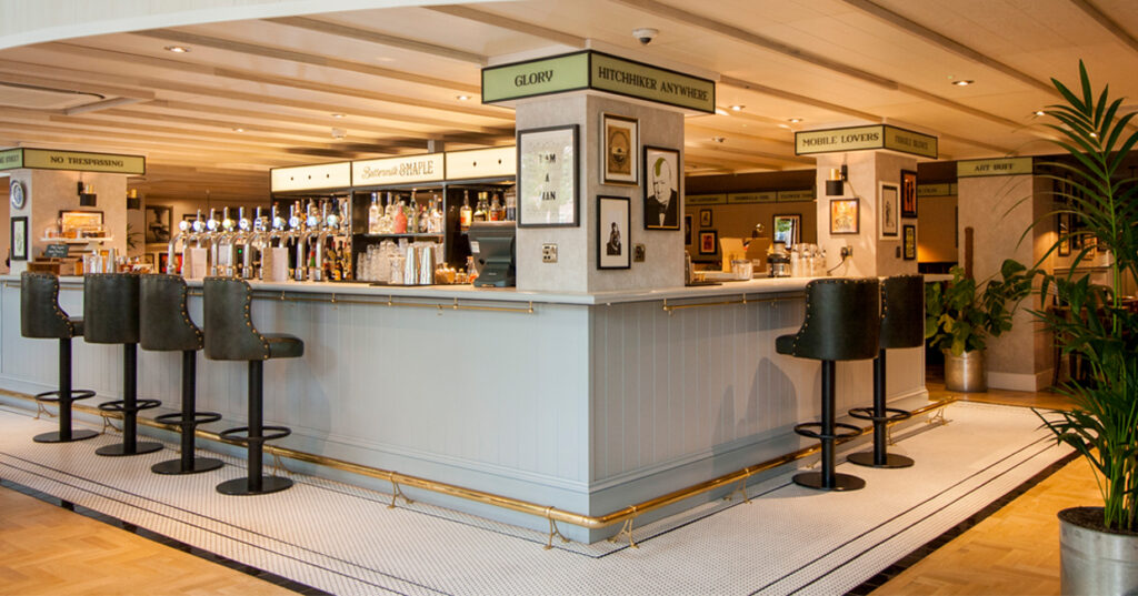 Leather bucket stools run around the perimeter of the bar and are reflected in the large poseur tables to the front of the restaurant, within a double height space.