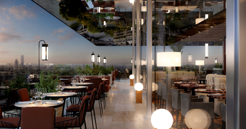 The Bonnie restaurant – bar – club, meanwhile, has been designed by Jordane Arrivetz of the Notoire agency. Spanning the 15th and 16th floors, Bonnie will have a breathtaking 360° view of the city, and is awash with curved edges, luxurious textures and bright colours that pay homage to the 1960s and 1970s.