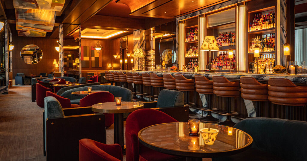 The bar itself is crafted from polished walnut and Cippolino marble, whilst the back bar elevation is clad in bronze mirror. The same Cippolino marble is also used to clad architectural columns and tabletops, creating a sense of cohesion. Custom bar stools are upholstered in blue leather. Timber-clad snug areas sit either side of the bar, with tan leather upholstered banquette seating.